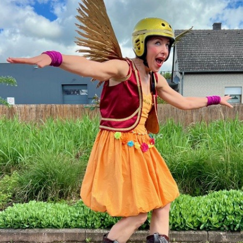 Sie ist eine Kunstfigur mit Aspekten des Clowns und die eines Engels.
