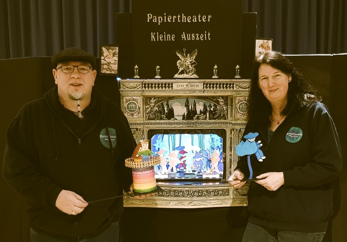 Unser Programm umfasst Aufführungen für Menschen jeden Alters und ist thematisch breit gefächert. Ein Zugpferd ist unser Stück zu Toleranz & Vielfalt „Kennt ihr Blauland?“ Die Kernaussage. „jeder ist gut so wie er ist! Jeder darf in seiner Farbe (ob Seelen- , Haut- oder Persönlichkeitsfarbe) leuchten!“ wird hier kindgerecht (für Kinder ab 2 jahre) erzählt, spricht aber Erwachsene nicht weniger an und sorgt auch bei diesen für Emotionen und Begeisterung. Drei historischen Märchen, nachproduziert anno 1887, laden zu einer Zeitreise in diese Zeit des Kaiserreiches ein und sprechen, in Sprache und Musik dieser Zeit, eher ein erwachsenes Publikum an. Theodor Storms „Das Märchen von der Regentrude" thematisiert den Klimawandel und einen nachhaltigen Umgang mit der Natur und Ressourcen. Unser Repertoire umfasst natürlich noch einige Stücke mehr. Unsere Vorstellungen sind ein außergewöhnliches Erlebnis, es gibt nur noch wenig aktive Papiertheaterbühnen in Deutschland. Das Papiertheater gehört seit 2021 zum immateriellen Kulturerbe der Unesco und richtet sich zwar auch an Familien und Kinder, gehört jedoch keineswegs in die Sparte Kindertheater sondern ist ein vielfältiges Kulturgut gleichwohl für erwachsene Zuschauer. (link: https://www.youtube.com/watch?v=oiDbDACoXe4 text: Videobeitrag Papiertheater)