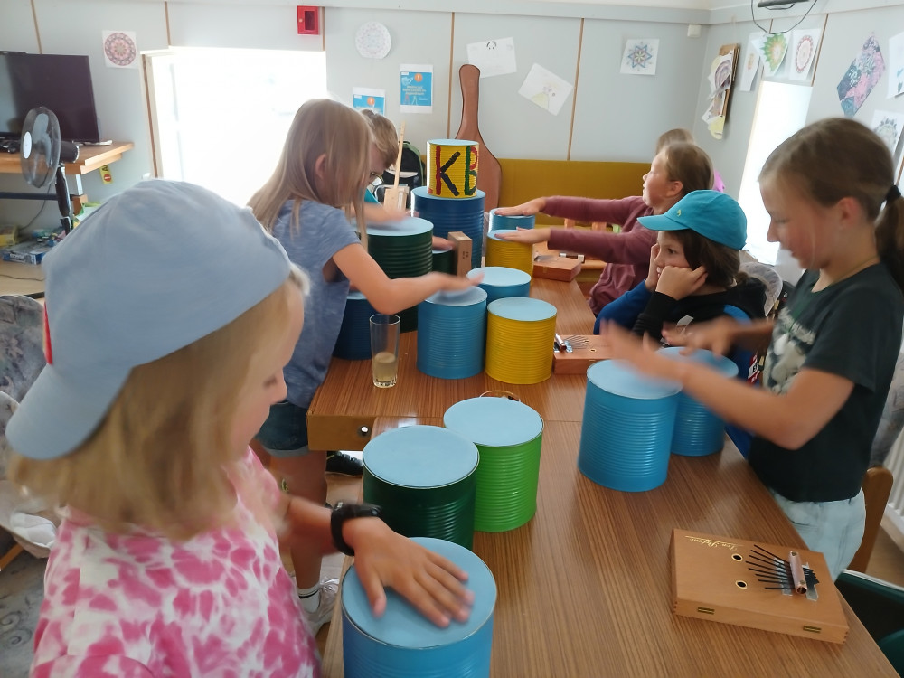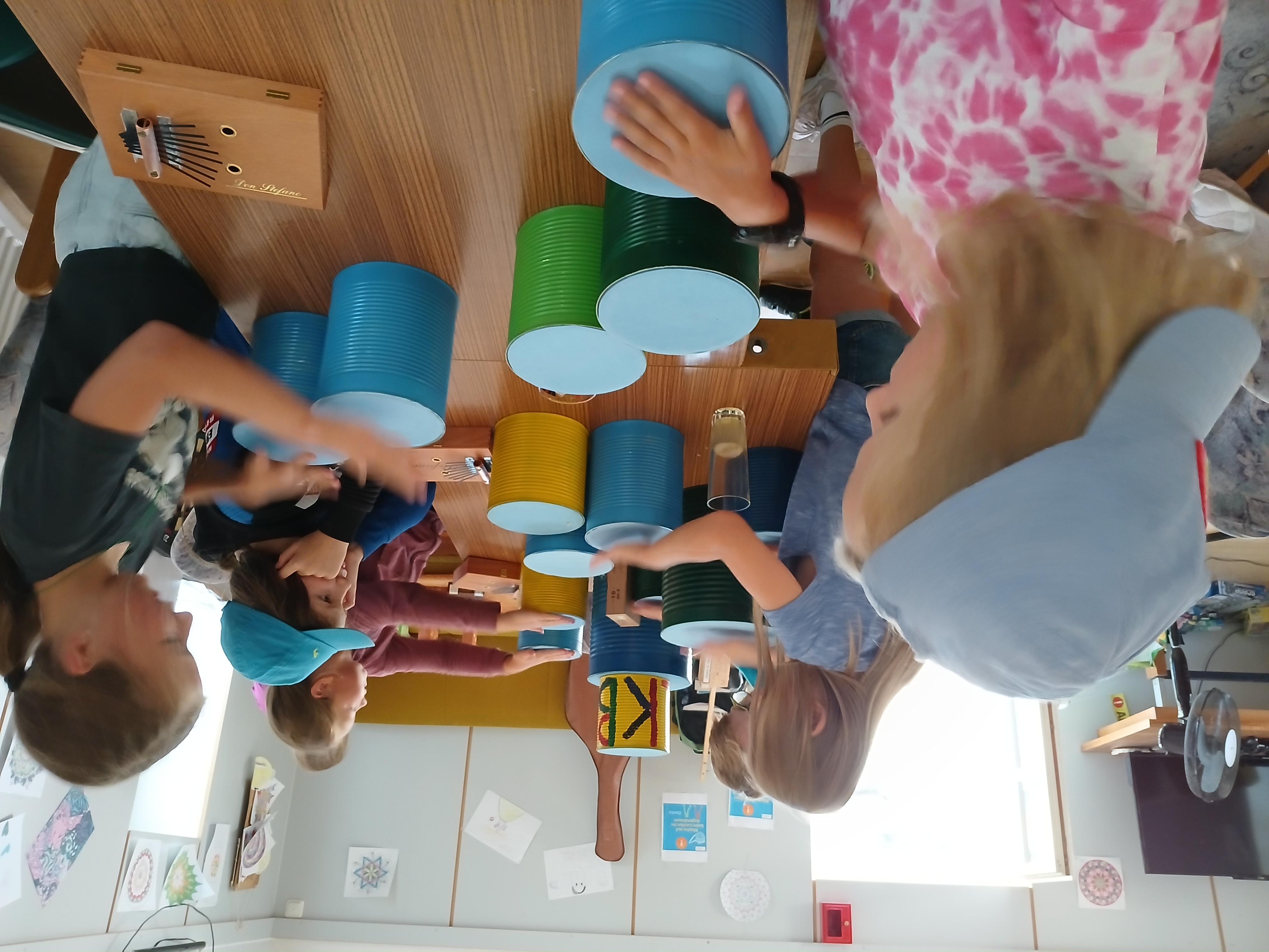 Diese Instrumente konnten von den Kindern beim Workshop mit Reinhard Roth gebastelt werden. Im Anschluss wurden sie von den Kindern noch bunt angemalt und verziert. Das Ergebnis waren selbst erstellte Instrumente, die sich leicht spielen lassen.