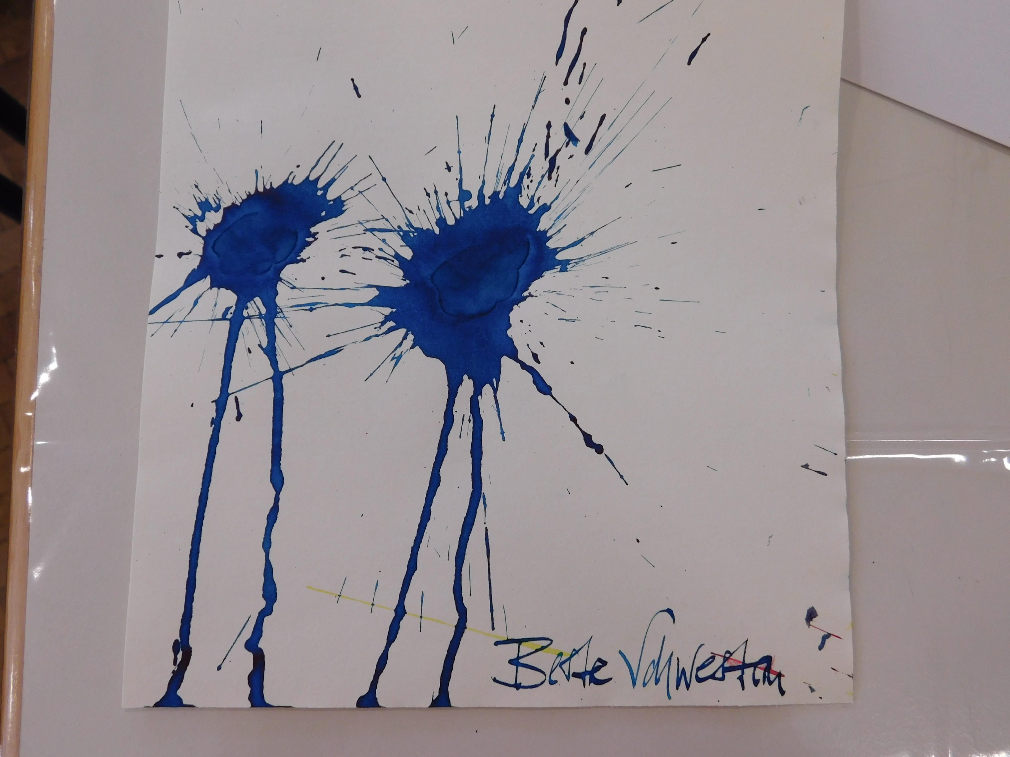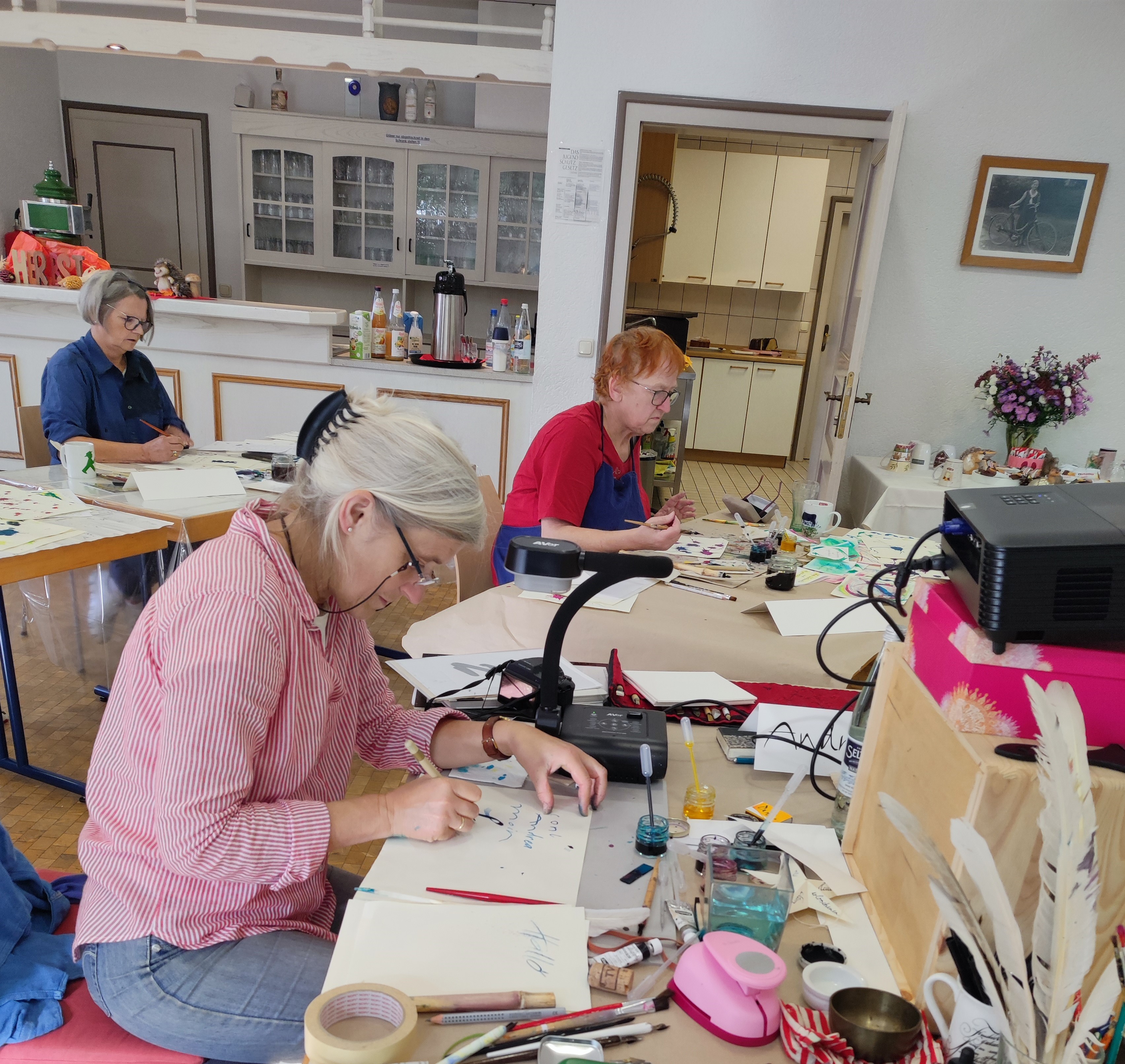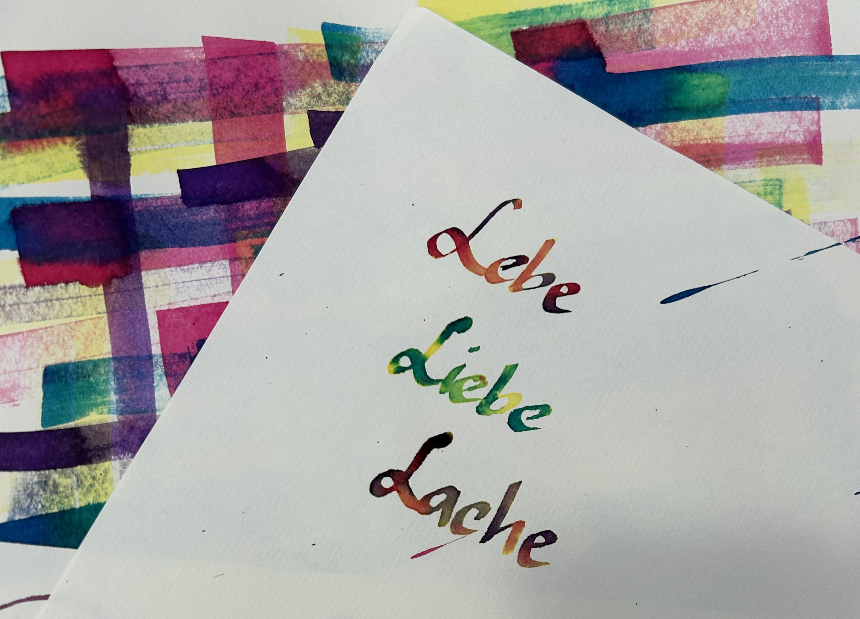 Die Begeisterung an den gelungenen Strichen, den spritzigen Linien und den eigenen Worten auf Papier war groß. In der Kombination aus Zufallskunst und kontrollierter Linie entstanden ganz eigene Karten und Lust auf Weiterführung.