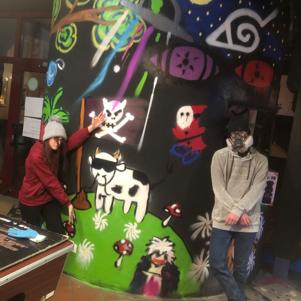 Die Jugendlichen selbst hatten keine Vorerfahrung mit Graffiti, weshalb mithilfe von Youtube-Videos, Skizzen und Sprayübungen geübt wurde, ehe sie die Wand an sich gestalteten. Die Motive konnten frei gewählt werden und lediglich die Größe und Technik wurde mithilfe der Anleitung von Frau Glück besprochen.