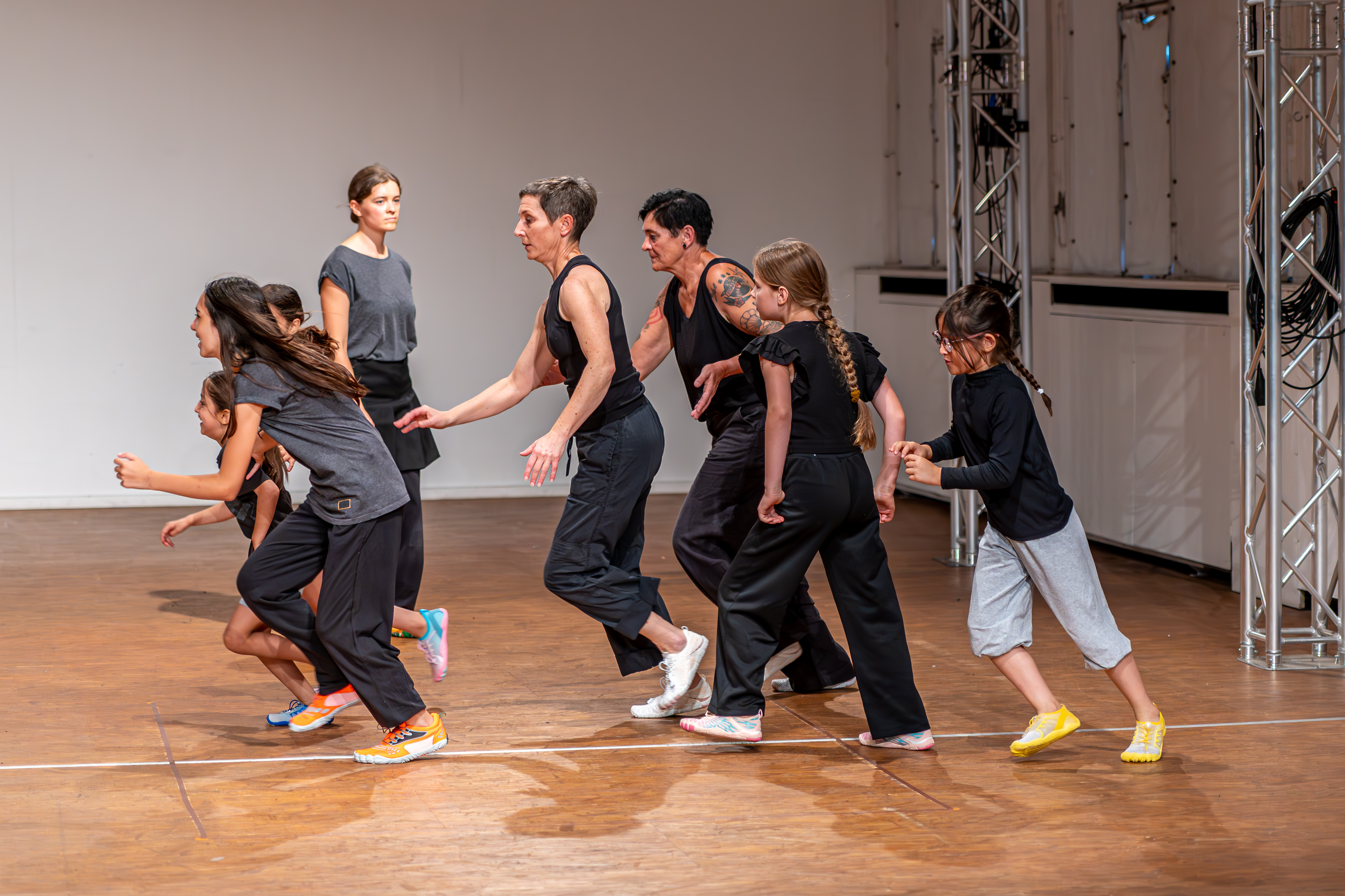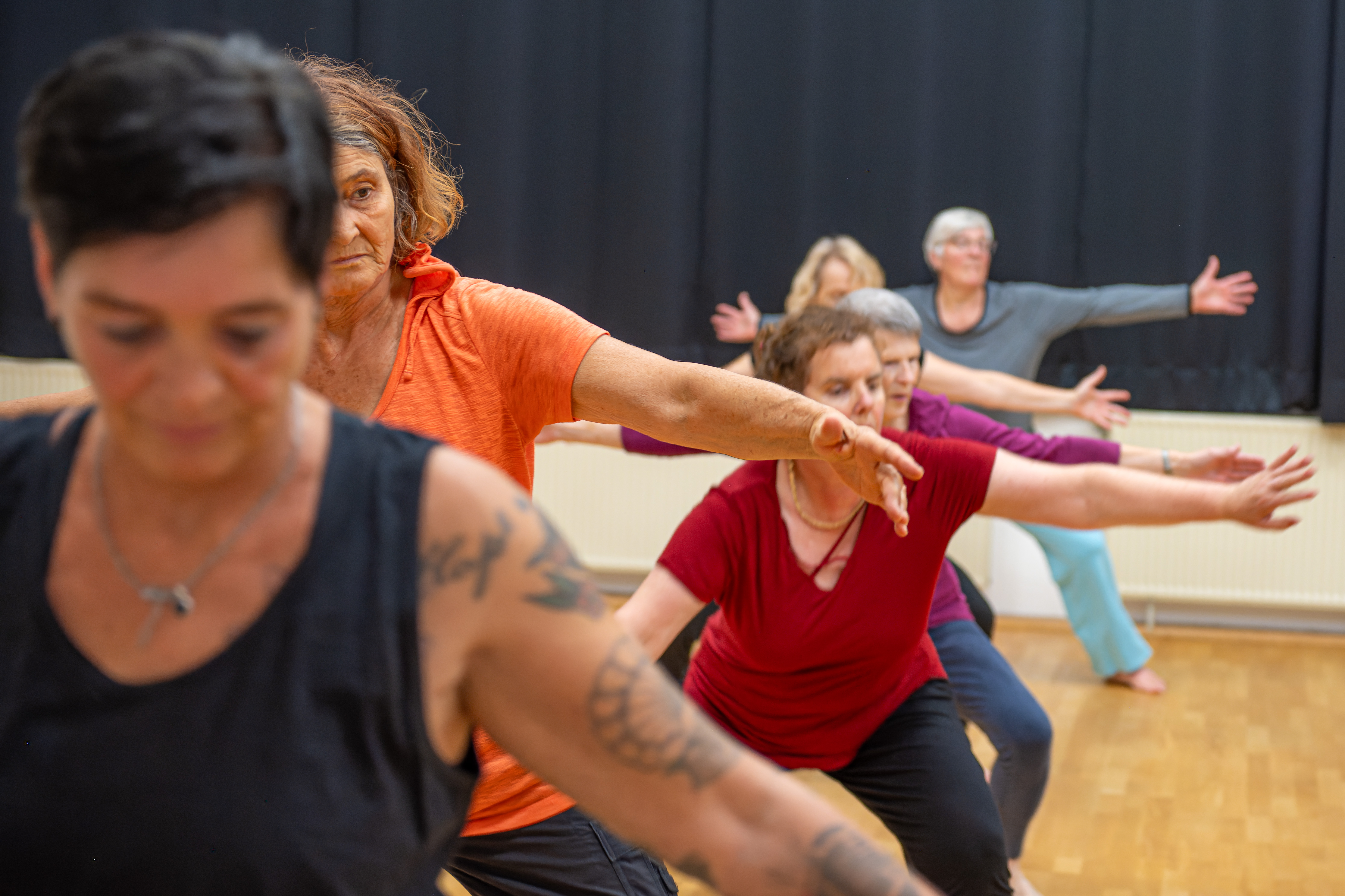Für das Sommeratelier zum community-dance Projekt haben sich sechs Frauen zwischen 50 und 68 Jahren angemeldet. Das Konzept eines möglichst barrierefreien Zugangs zu Bewegung, Tanz und Körper/Raum-Wahrnehmung hat schnell zu einer positiven Gruppendynamik und einem freudvollen Umgang mit neuen kreativen Erfahrungen geführt. Eine Teilnehmerin hat sich anschließend für den Schritt vom Atelier auf die Bühne entschieden.
