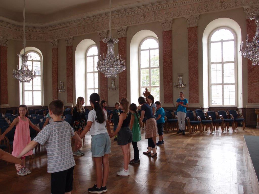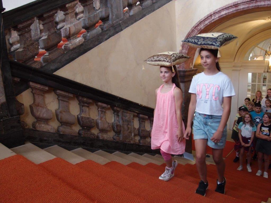 „Das sind ja gar keine Kleider! Nur lauter Einzelteile!“, sagte eine Schülerin, als Frau Husebø demonstrierte, was eine Dame alles anziehen musste, um so prächtig auszusehen, wie auf den Gemälden im Schloss. Den Herren ging es da nicht viel besser. Und sogar Kinder mussten bereits enge Korsette und darüber prächtig bestickte Kleidung tragen. Die Dritt- und Viertklässler waren sich einig: Die heutige Kindheit ist besser. Und als Frau Husebø noch berichtete, dass die Menschen damals keine fremden Menschen ansprechen durften, war die Empörung bei den Schülerinnen und Schülern groß. Nur gut, dass die jungen Leute in der Barock-Zeit erfindungsreich waren und sich eine Geheimsprache mit ihren Fächern ausgedacht haben. Das Highlight der Woche war das Fotoshooting im Schloss. Mit Krone, Zepter, Schild und Schärpe – alles vorher selbst gebastelt – posierten die Dritt- und Viertklässler als Graf beziehungsweise Gräfin. Dabei durften sie unter anderem ganz nah an den Thron, an historische Instrumente und sogar in das blaue Gemach, in das sonst keine Besucher dürfen! Auch, wenn das Leben im Barock nicht immer einfach war: „Einmal fühlen, als wär‘ ich hier der Chef! Das war echt cool!“ Dieses Erlebnis bleibt den Kindern bestimmt noch lange in Erinnerung.