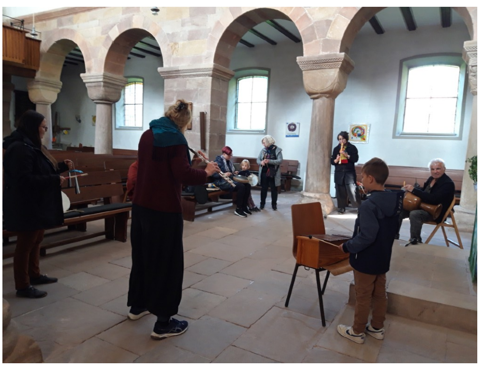 Höhepunkte waren die Improvisationstreffen in der Kirche in Kirchhosbach und der Klosterkirche in Reichenbach. Hier wurden vielfältige Instrumente wie beispielsweise Klavier, Saxophon, Querflöte, Xylophon, Tombak, Bratsche, Akkordeon aber auch die eigenen Stimmen eingesetzt. Dabei änderten sich die Gruppenzusammensetzungen immer wieder, was zu neuen musikalischen Dynamiken führte. Teilnehmende erprobten das Wechselspiel von Frage und Antwort, sowie die Kunst des bewussten Hörens. Ein Treffen stand im Zeichen der Harmonien. Neben klassischen Stücken wie "Bella Ciao" und "Autumn Leaves" entstanden einzigartige Improvisationen, die die Teilnehmer*innen musikalisch herausforderten und zusammenbrachten. Etwas besonderes war der Moment, als bei einem Treffen ein Nachbar spontan mit dem Akkordeon neue Klangwelten eröffnete.