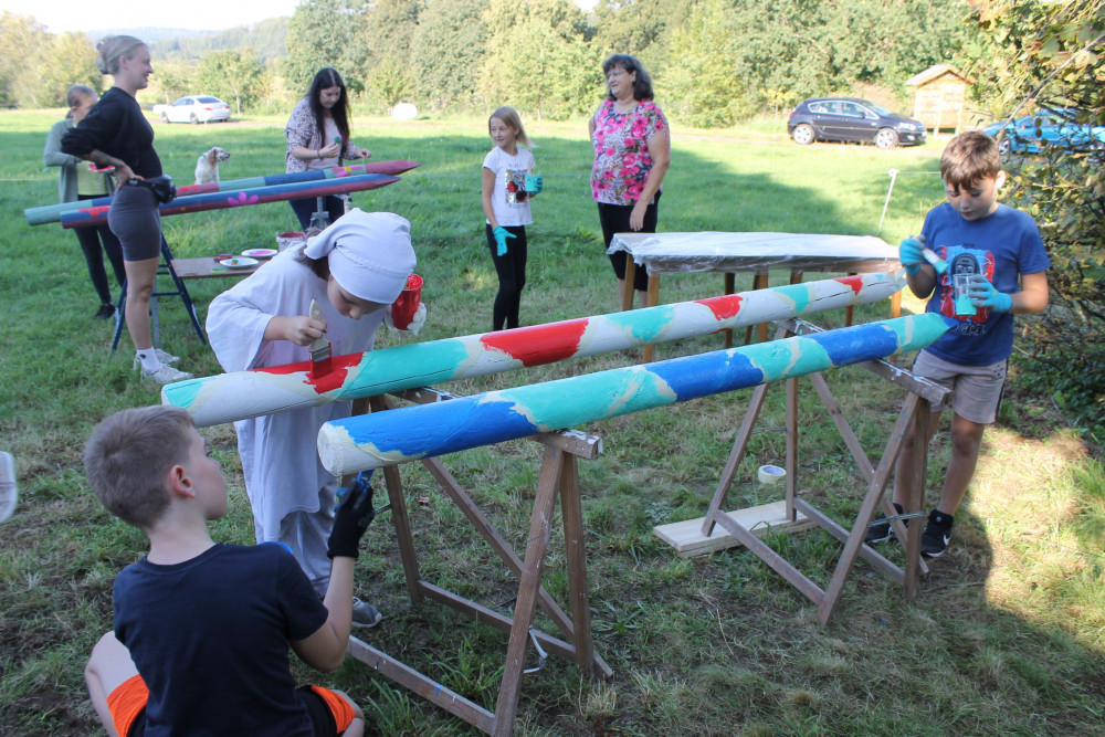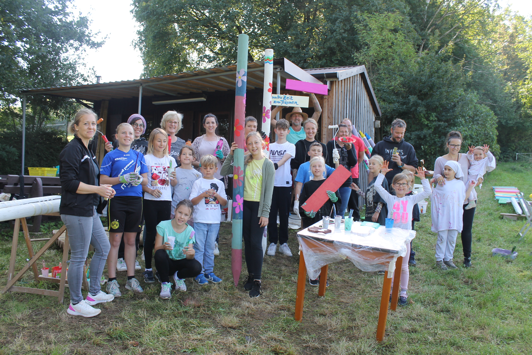 An der Vogelschutzhütte fanden sich mehr als 30 Teilnehmende ein, die motiviert und kreativ werkeln wollten. Andre Leger hatte die künstlerische Leitung übernommen und wurde von Christel Cordes unterstützt. 40 Weidepfosten in verschiedenen Längen lagen parat, die von den kleinen und großen Gestalter*innen nach der Grundierung mit viel Farbe in leuchtende Hingucker verwandelt wurden. So entstanden im Laufe des Vormittags kunterbunte Werke mit diversen Motiven. Die Weidepfosten werden nach Fertigstellung noch mit Klarlack überzogen und danach müssen geeignete Plätze zum Aufstellen in der Gemarkung gesucht werden.