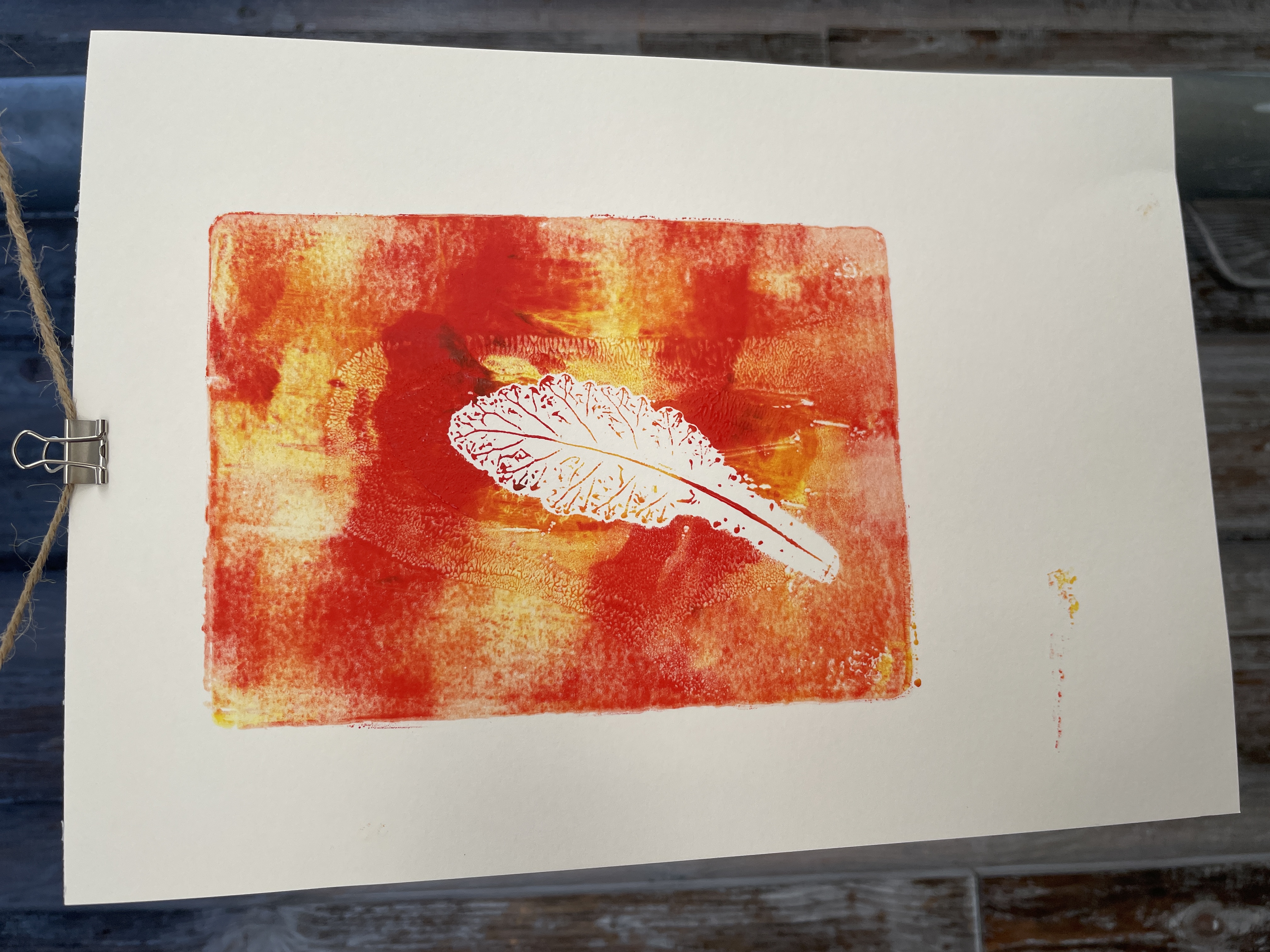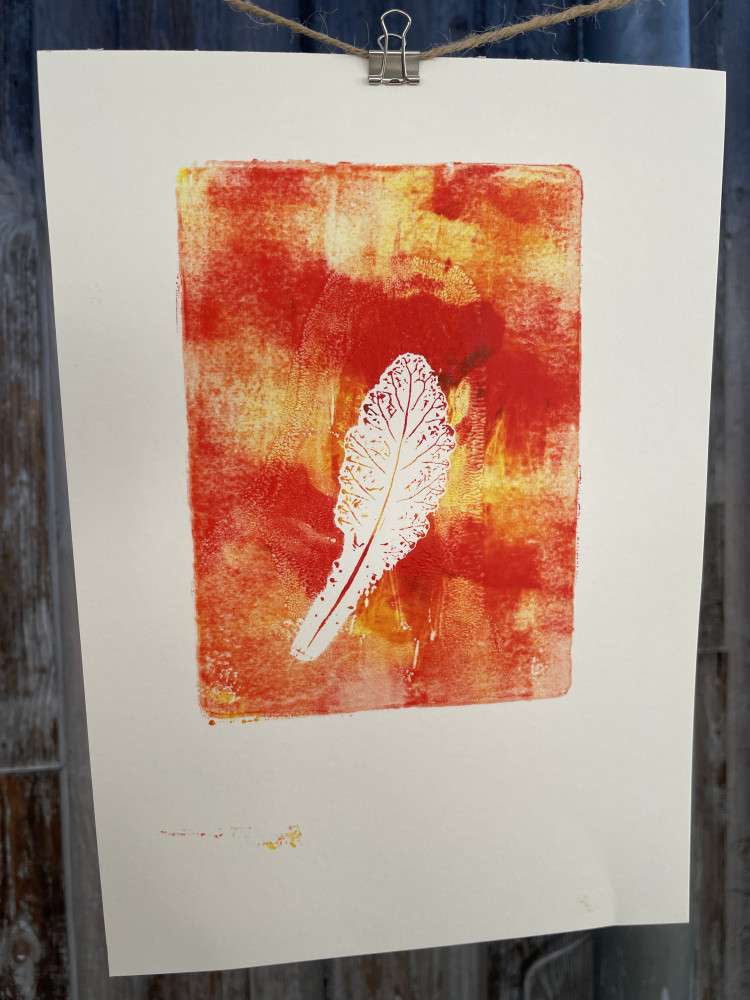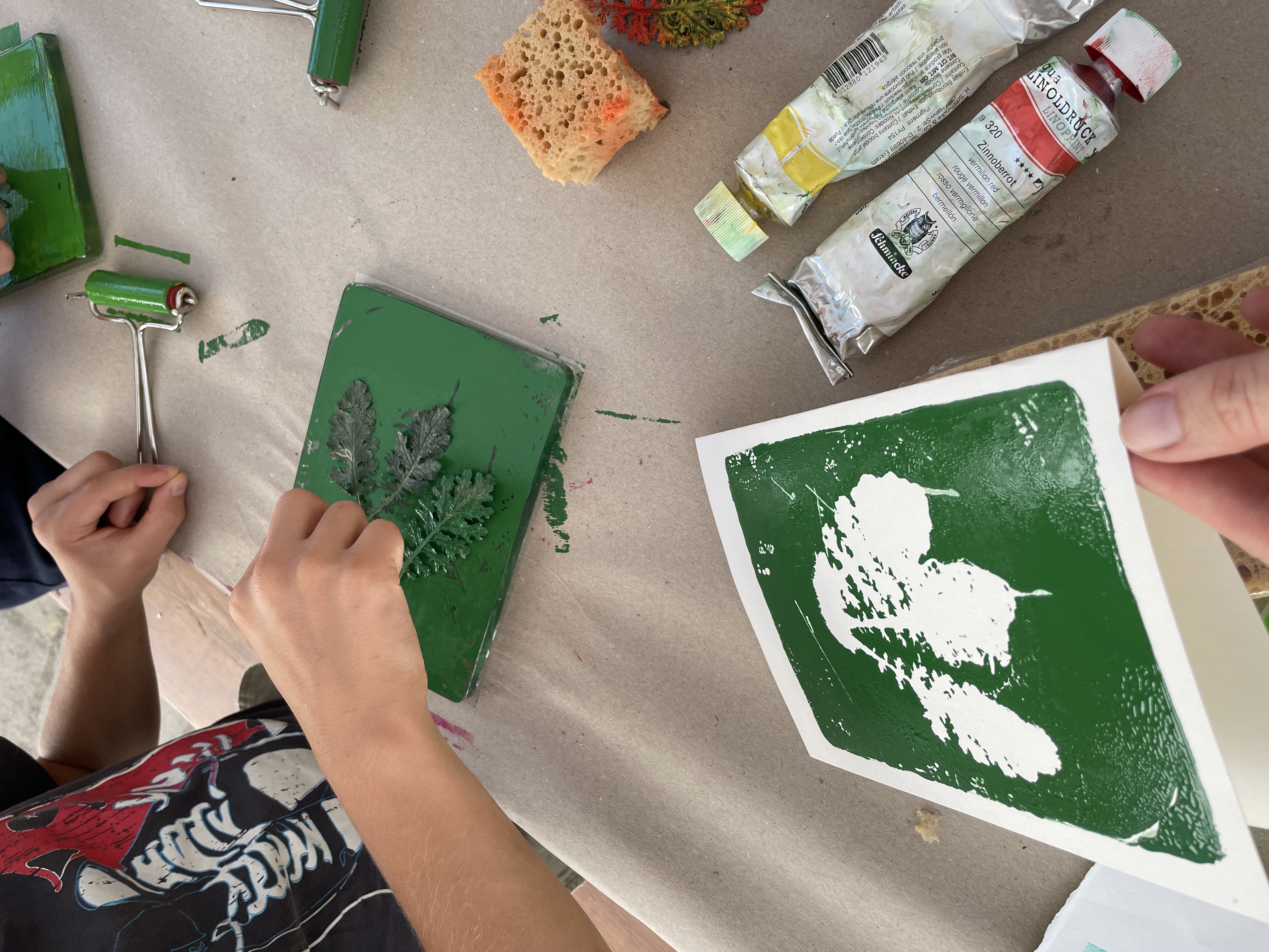 Die Vielfalt von Pflanzenblättern und Blüten konnte beim Druckworkshop bewundert werden. Mithilfe von Gellyplatten wurden unter Anleitung zahlreiche Pflanzen gedruckt. Viele der entstandenen Drucke hingen zum Trocknen an Wäscheleinen und waren somit zugleich Teil der großen slowArt Kunstausstellung. Alle Kunstwerke aus den Workshops durften die Teilnehmer*innen mit nach Hause nehmen.